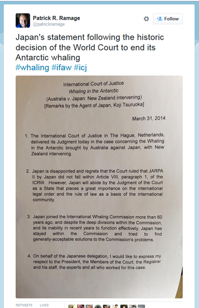 Patrick R Ramage tweet RE japan statement to accept ICJ ruling dated 31 March 2014